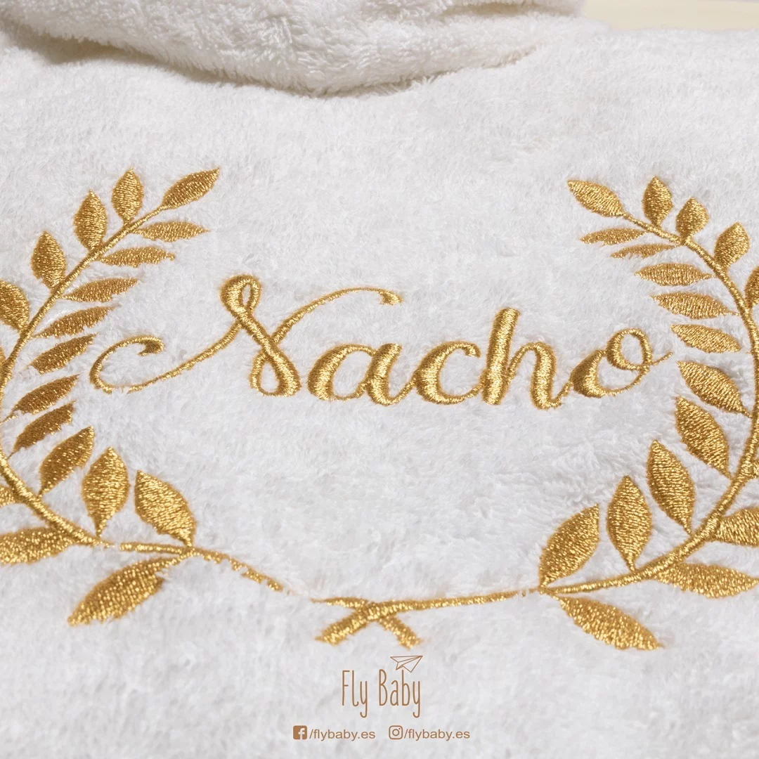 Albornoz para niño bordado con laureles y el nombre del niño. Diseño inspirado en nuestra Colección Diamond. Bordado con hilo de oro metalizado o hilo de plata metalizado.