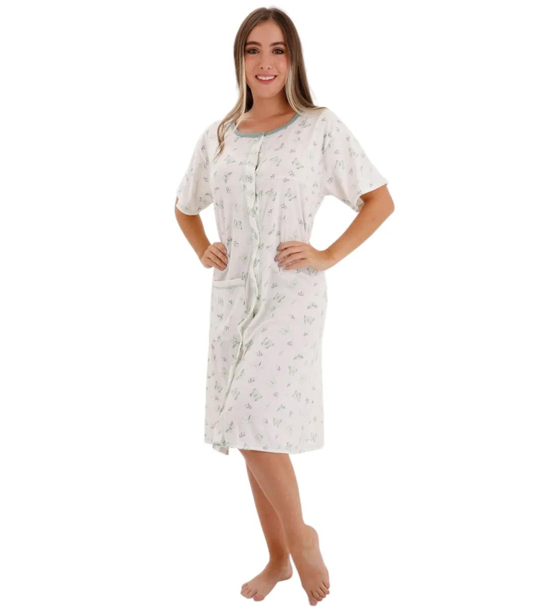 Su diseño clásico con cuello redondo y manga corta te brinda una sensación de frescura y libertad de movimiento, ideal para estar en casa con estilo y comodidad. Confeccionada en spandex algodón, esta bata se adapta con delicadeza al cuerpo, proporcionando comodidad y frescura durante todo el día.