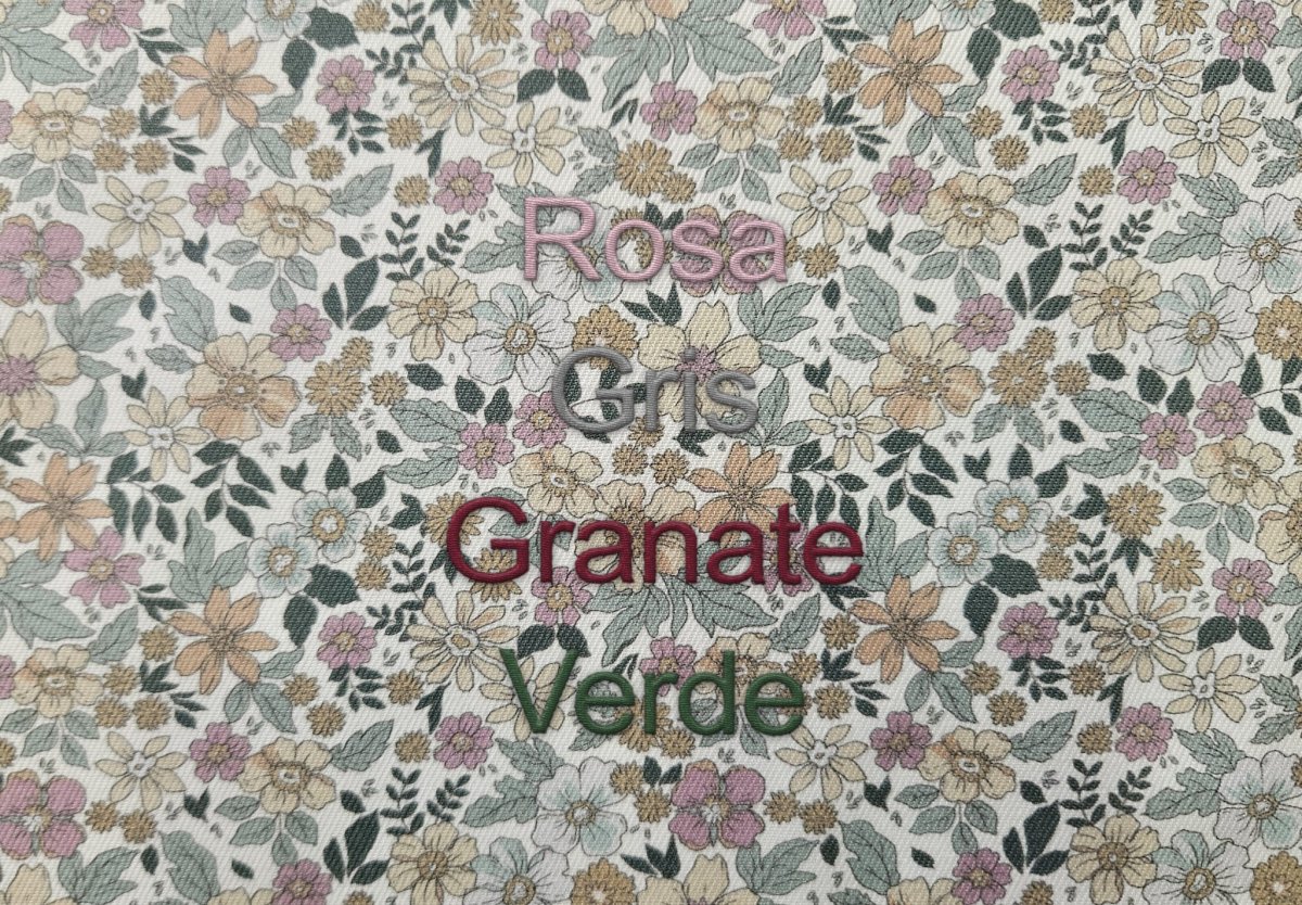 Bolsa de muda en nuestro estampado exclusivo Carlota de flores mostaza, beige, rosa empolvado y verde, con botón de nácar y goma en el lateral.