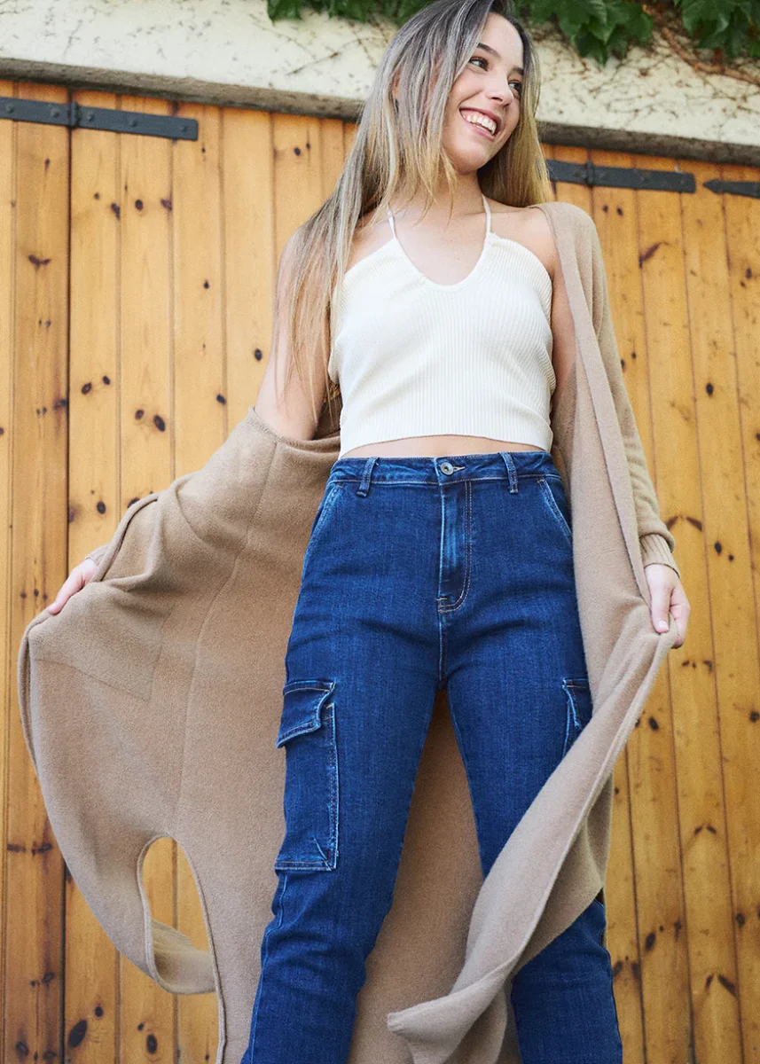 Cárdigan largo de punto con bolsillos delanteros. Manga larga. Laterales abiertos.