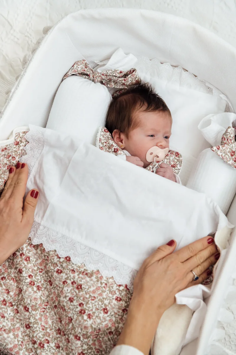 Cojín antivuelco doble de piqué blanco y lazos en nuestro estampado exclusivo Jimena en tonos rosas y rojizos