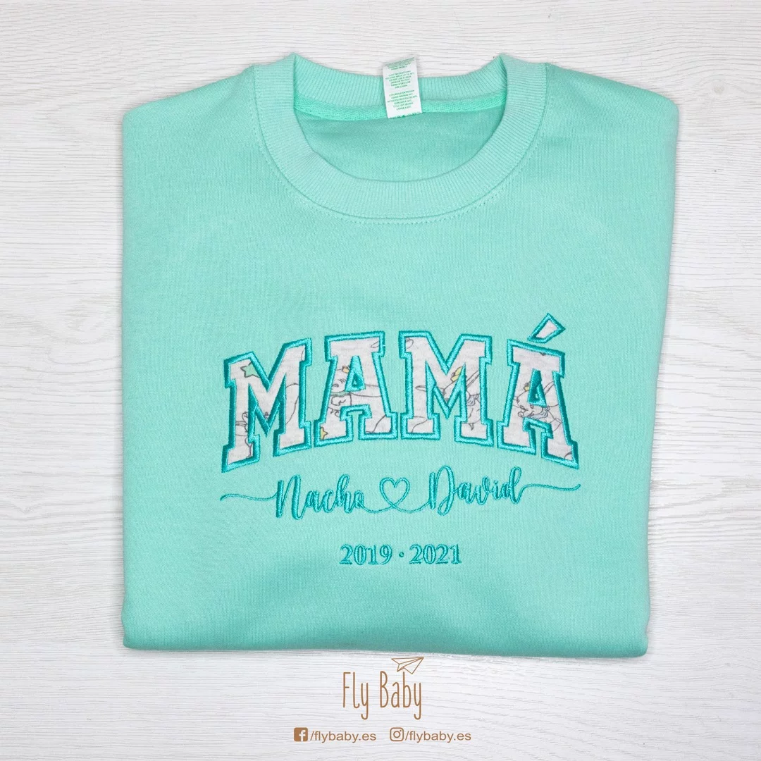 Debajo de la palabra “Mamá”, bordamos los nombres de los hijos en una tipografía elegante de caligrafía, seguidos de los años de nacimiento de los pequeños. Este detalle convierte la sudadera en un recuerdo eterno, perfecto para lucir o conservar como una joya familiar.