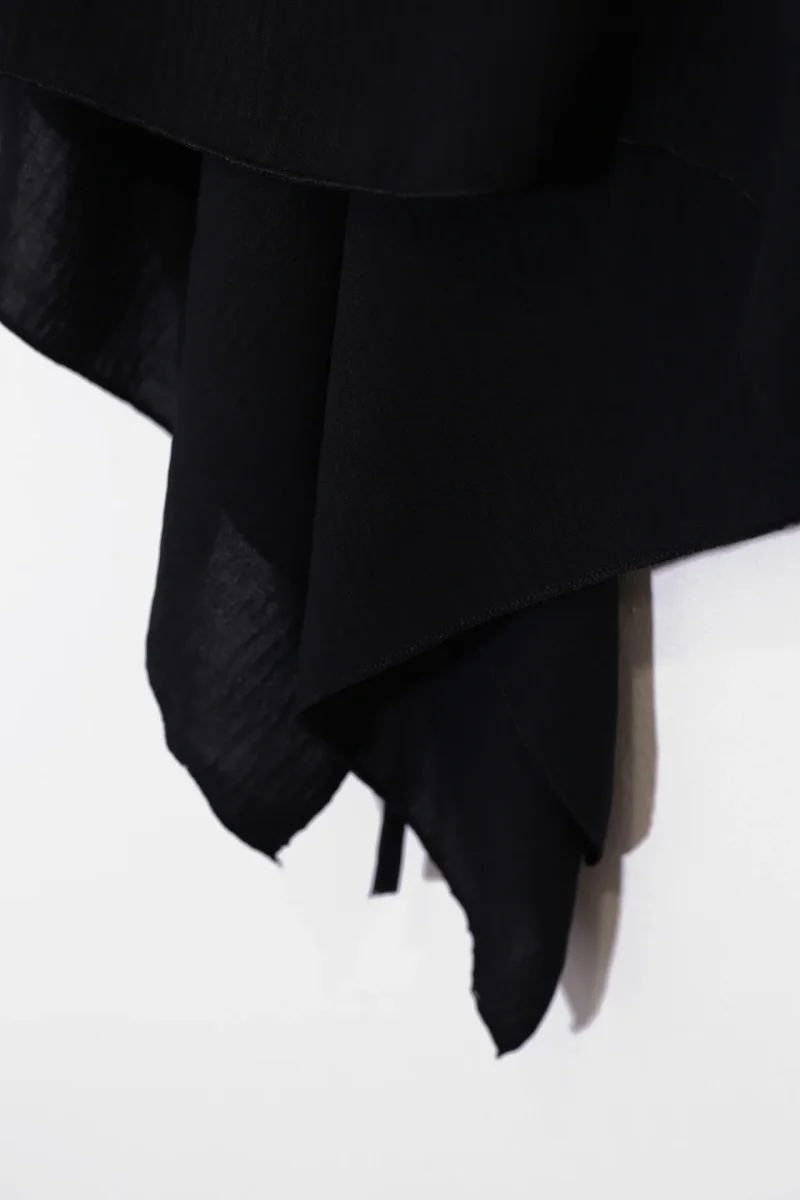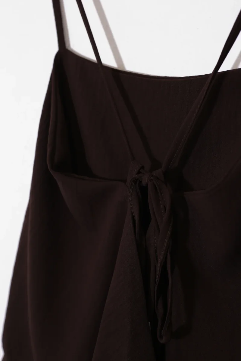 Top fluido asimétrico con escote recto y tirantes finos. Cierre en espalda con cordones anudados. Bajos asimétricos.