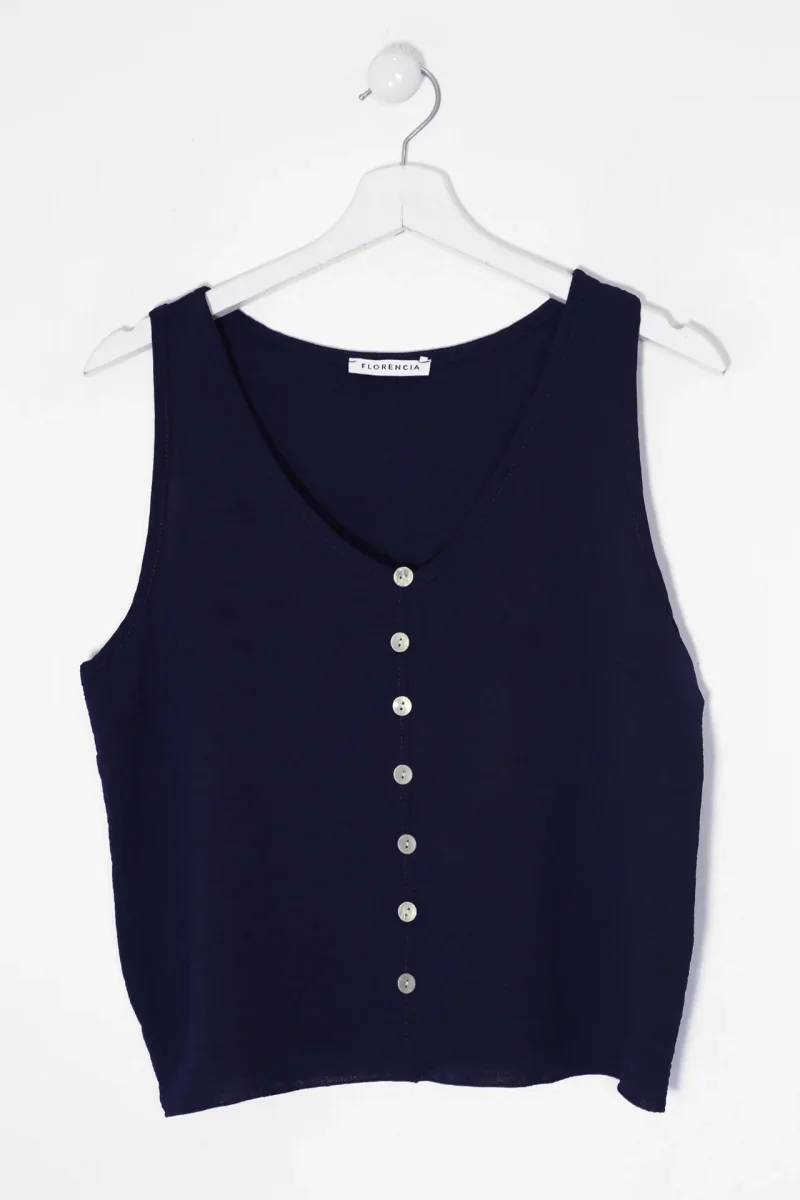 Top sin mangas con escote en punta. Detalle de botones decorativos en frontal. Corte fluido. Tejido ligeramente elástico.