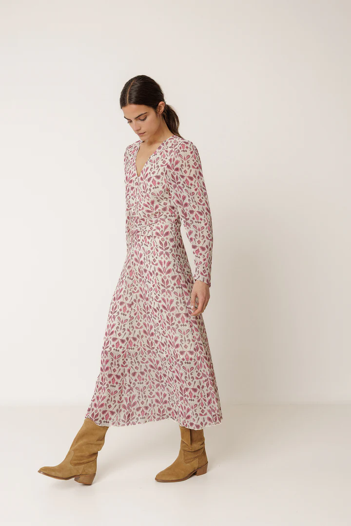 Vestido de georgette en viscosa sostenible con escote en V en el delantero y espalda. Tiene manga farol que se estrecha en el puño y un entalle en la parte delantera que se ajusta perfectamente a la silueta.